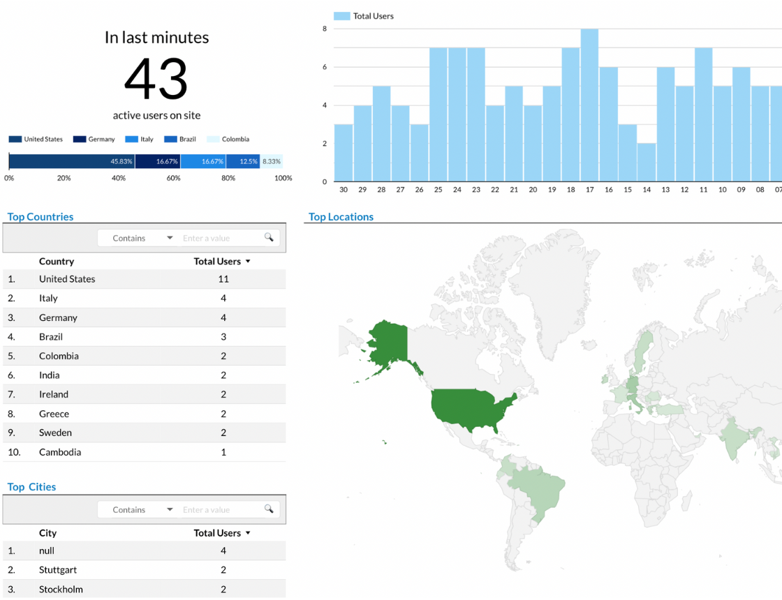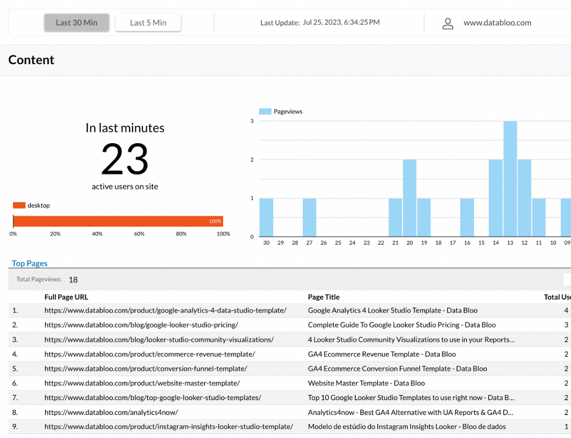 Content: The content report offers a granular understanding of your current visitors’ online journey in the last minutes. Track the pages they are engaging with, view their URLs, and discover which content captivates your audience the most.