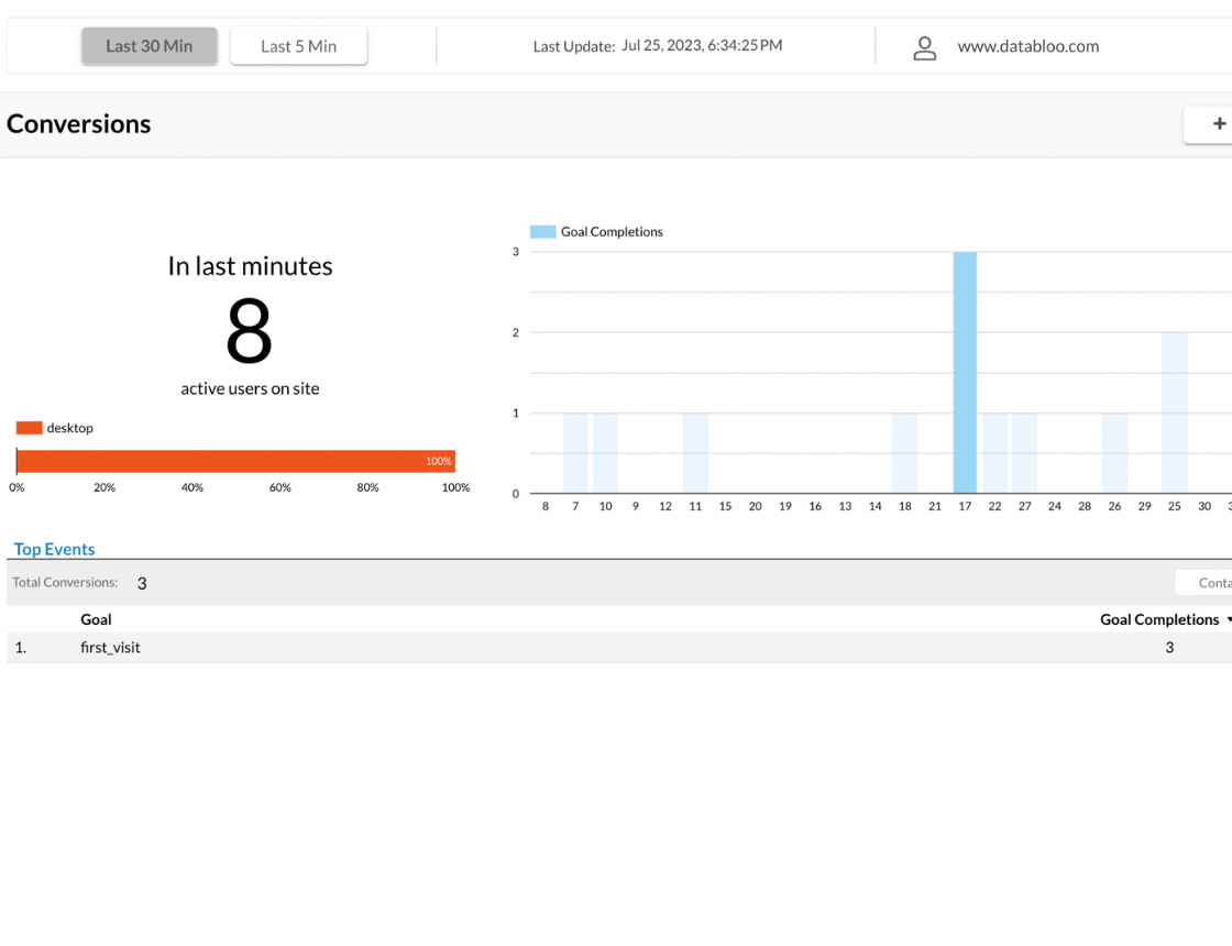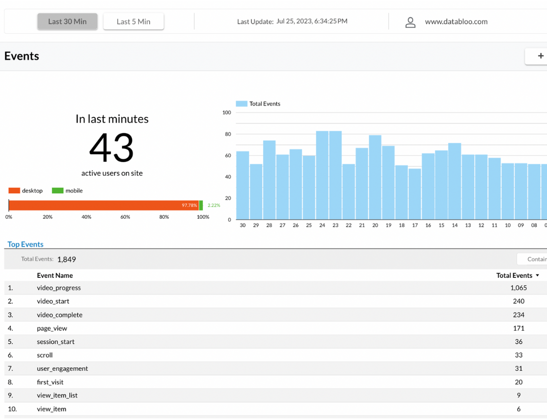 Events: Measure the top interactions of your users on your website like button page scroll, clicks, downloads, and video plays. The real-time events report allows you to monitor these actions as they unfold, offering real-time feedback on the effectiveness of your website elements. This will help you to identify pain points (i.e. broken website forms), optimize user interactions, and boost overall engagement.